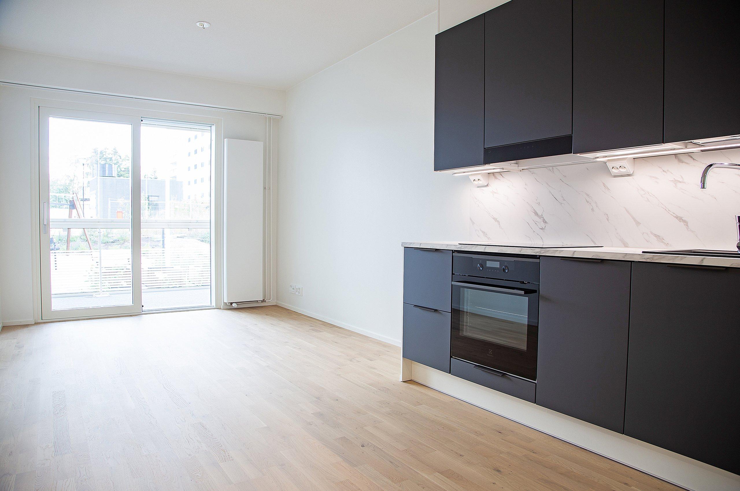 Asunnon sydän on avoin keittotila, joka avautuu olohuoneeseen. Keittiotilan tummanharmaa kalustus on Puustellin valikoimista, kodinkoneet Electroluxin. Asunnon huoneissa on tammiparketti.