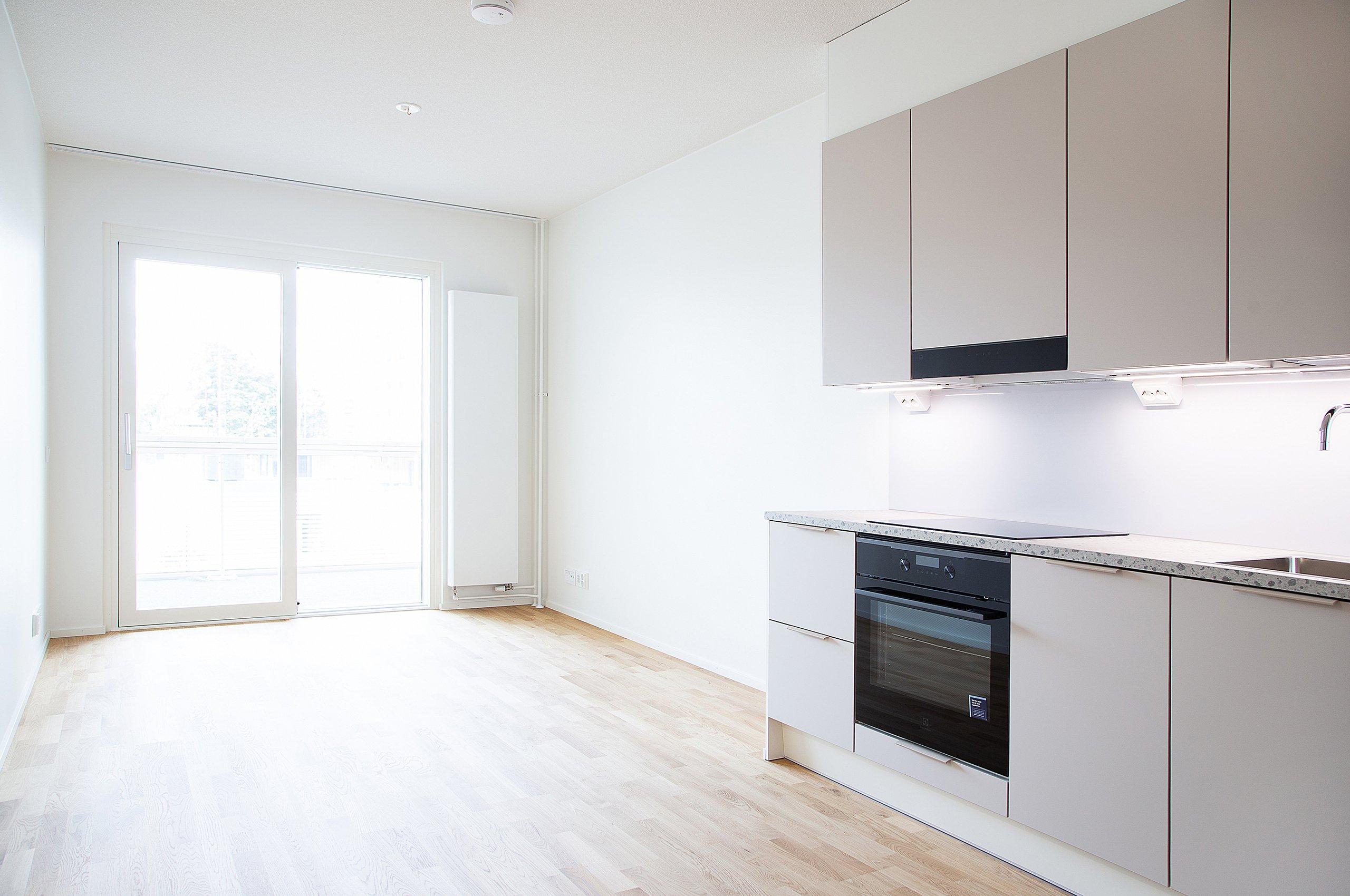Asunnon sydän on avoin keittotila, joka avautuu olohuoneeseen. Keittiö on Puustellin valikoimista, kodinkoneet Electroluxin. Kalusteovissa on tyylikäs hiekanharmaa sävy. Asunnon huoneissa on tammiparketti.
