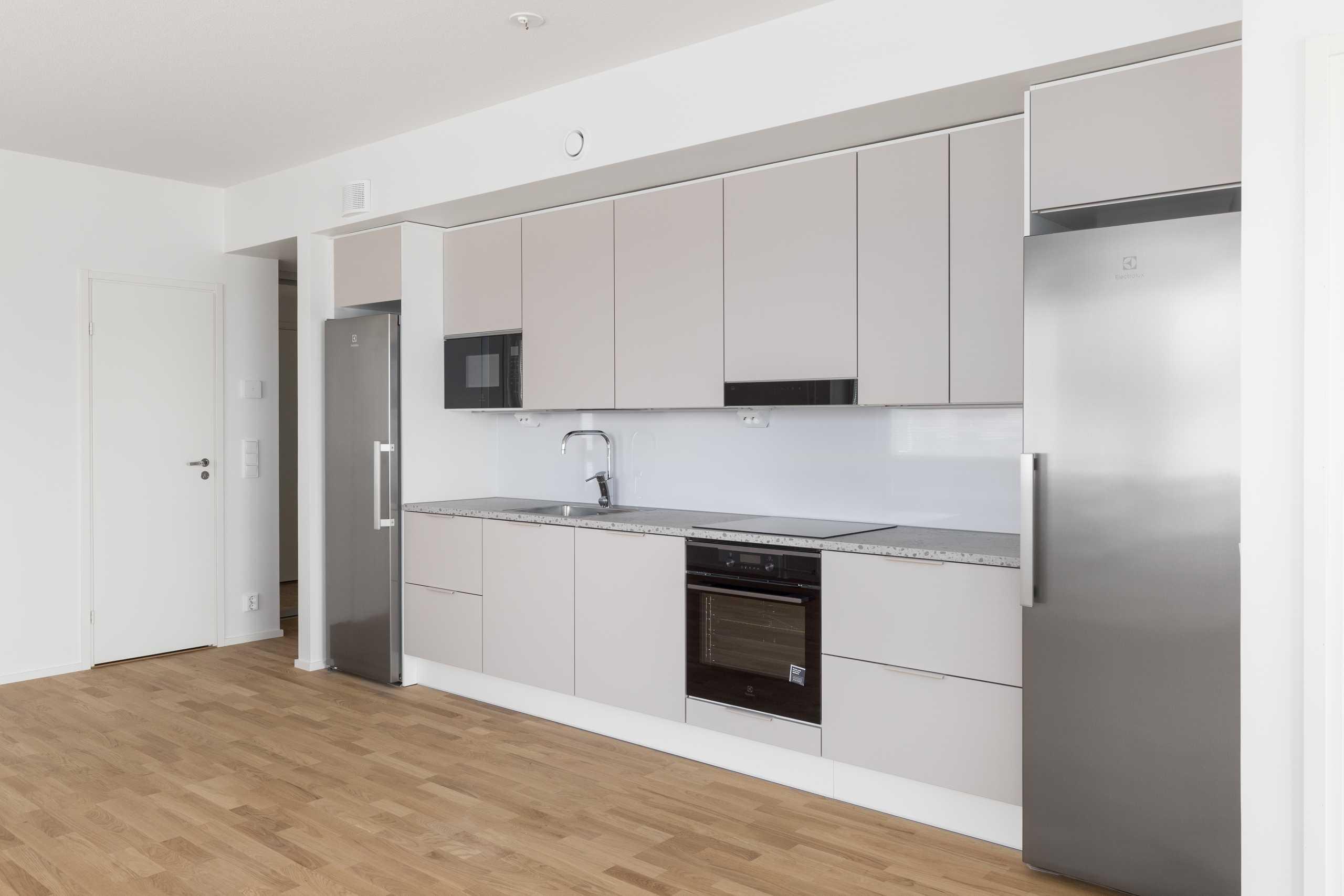 Tässä asunnossa on potentiaalia moneen. Avoin keittotila, jossa tilaa ruokapöydälle. Keittiö on Puustellin valikoimista ja kodinkoneet Electroluxin, esimerkkinä täyskorkeat kylmälaitteet. Kalusteovissa on tyylikäs hiekanharmaa sävy.