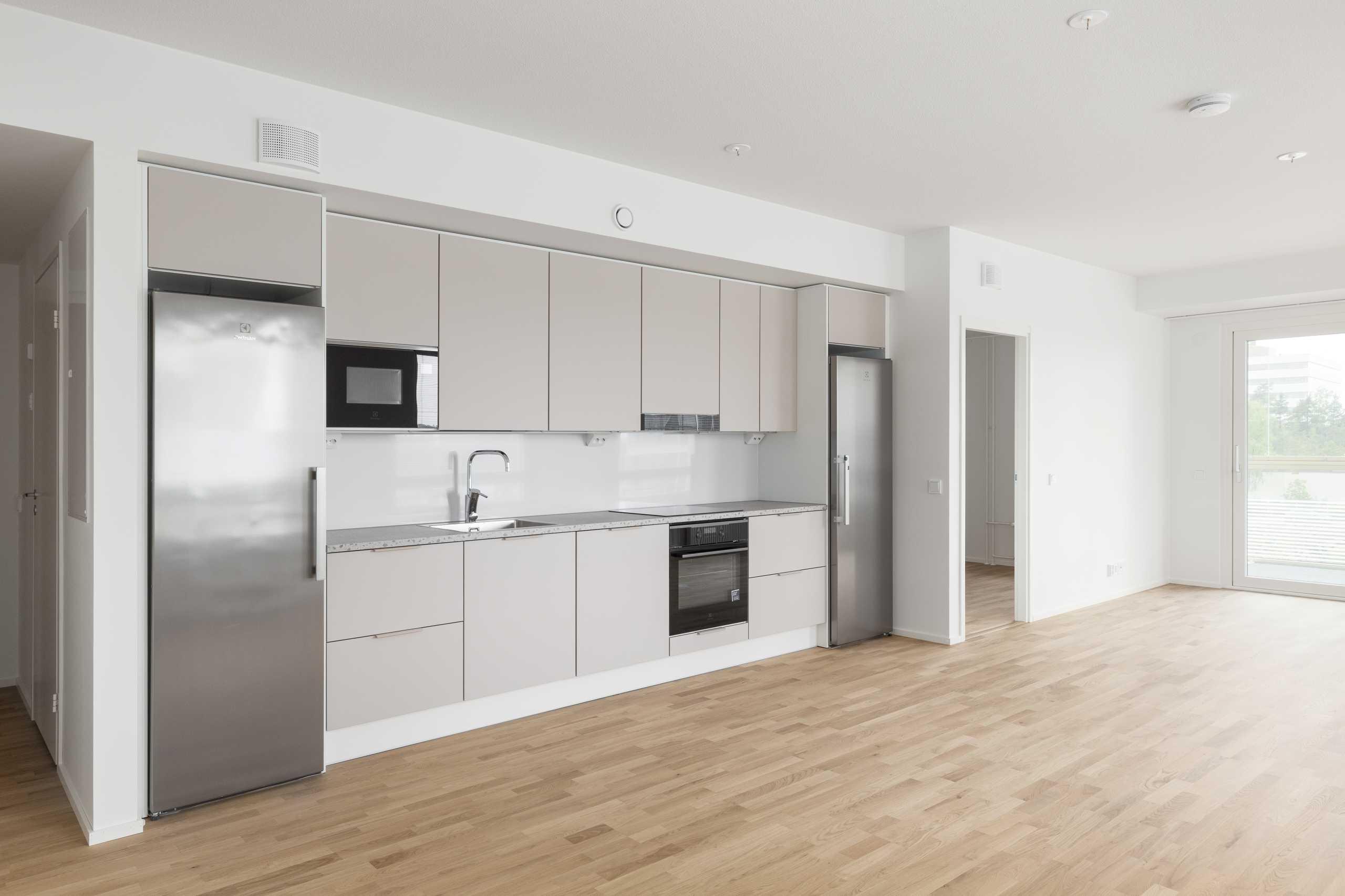 Tässä asunnossa on potentiaalia moneen. Avoin keittotila, jossa tilaa ruokapöydälle. Keittotilan materiaalit ovat Puustellin valikoimista, kodinkoneet Electroluxin.