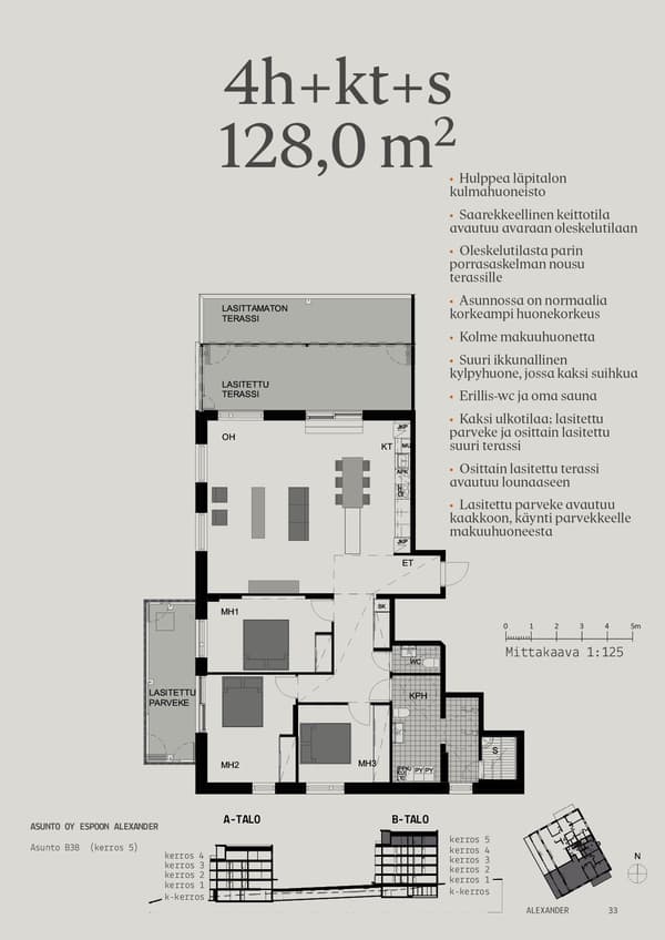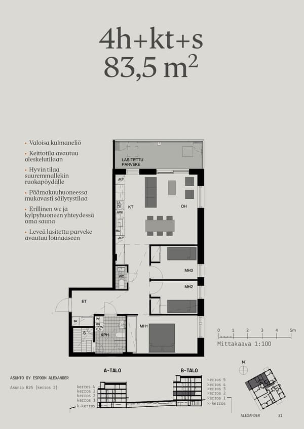 Asunnon oleskelutilassa on ikkunat etelään ja länteen, joten valo pääsee tulvimaan sisään. Keittotilan materiaalit ovat Puustellin valikoimista, kodinkoneet Electroluxin. Lattiassa jalan alla on tyylikäs tammiparketti.