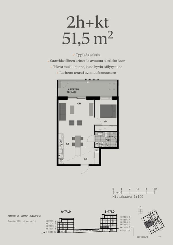 Keittotilan materiaalit ovat Puustellin valikoimista, kodinkoneet Electroluxin. Lattiassa on tyylikäs tammiparketti. Kylpyhuoneen kalusteet ovat Svedbergsin.