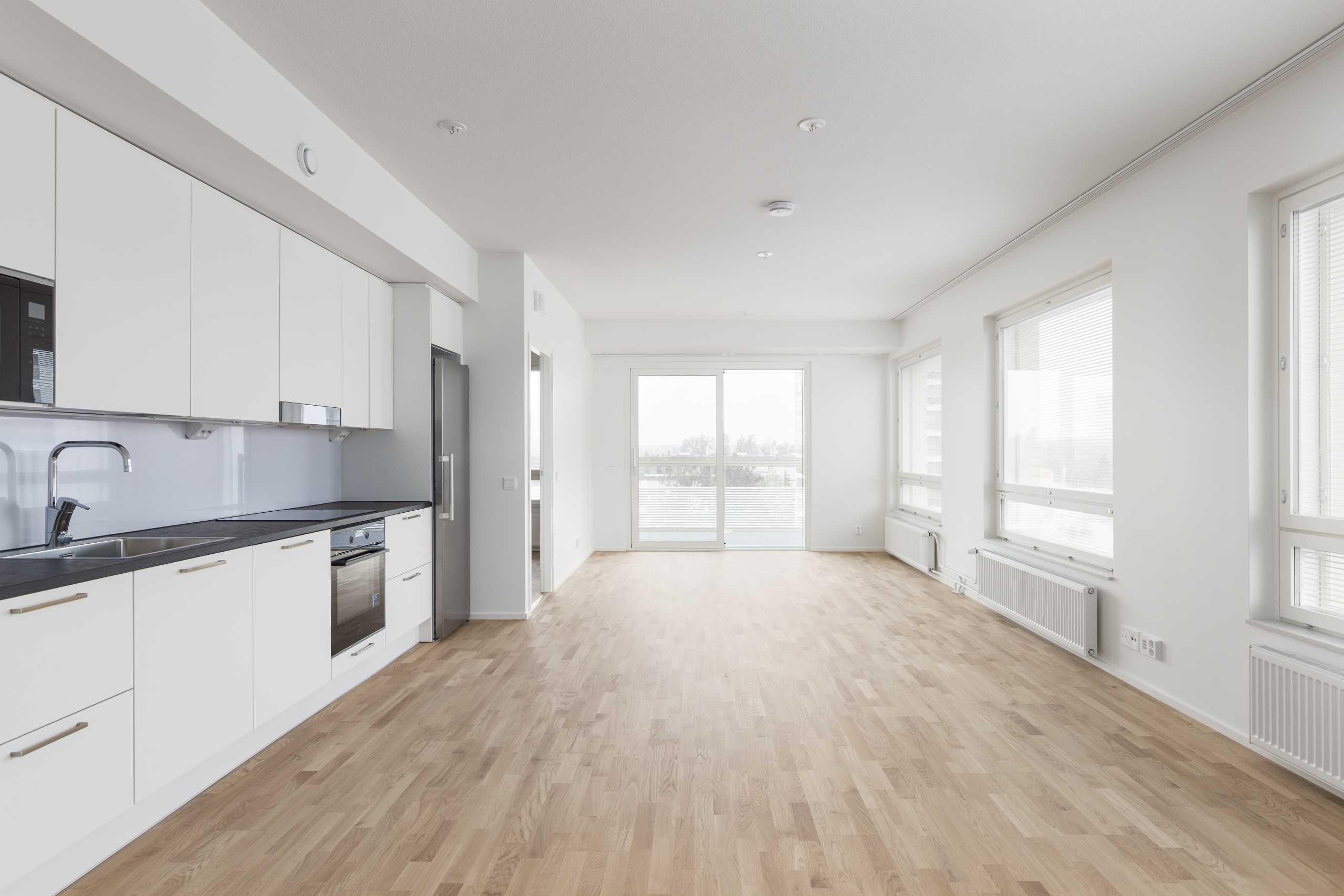 Tässä asunnossa on potentiaalia moneen. Avoin keittotila, jossa tilaa ruokapöydälle. Keittotilan materiaalit ovat Puustellin valikoimista, kodinkoneet Electroluxin. Keittotilan täyskorkeat kylmälaitteet säilövät isommankin perheen ruoat.