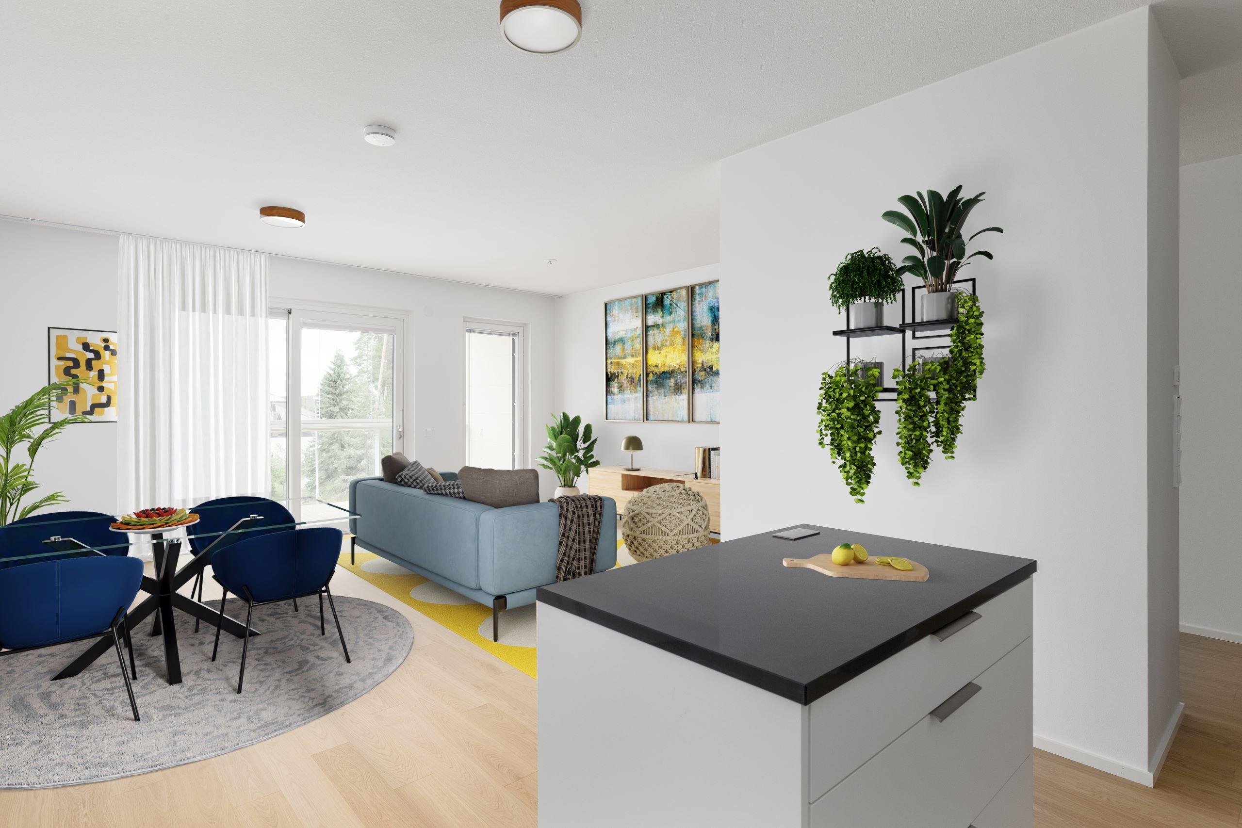 Tässä valoisassa asunnossa on ikkunat kahteen suuntaan, kaakkoon ja lounaaseen. Asunnon keskiössä on saarekkeellinen keittotila, joka avautuu viihtyisään oleskelutilaan. Matalalämpöisen lattialämmityksen ansiosta seinillä ei ole pattereita, joten asunnon sisustaminen on vaivattomampaa.