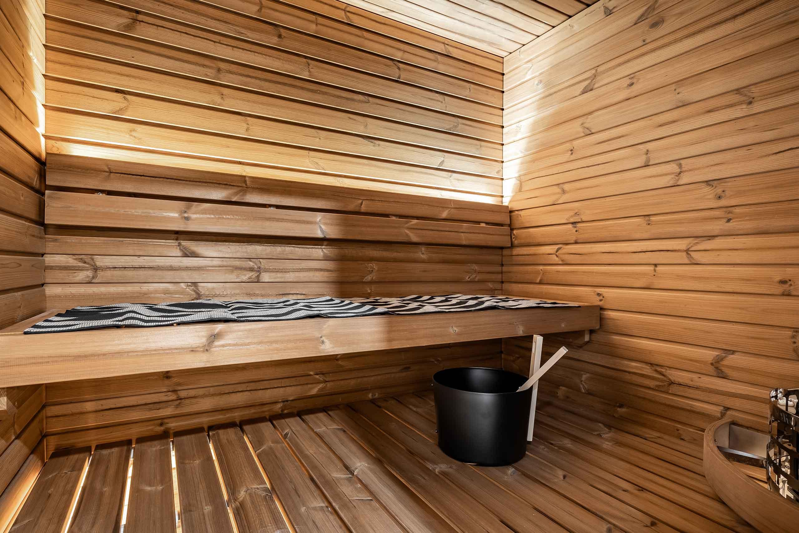 Kylpyhuoneessa on hiekansävyiset laatat, seinälaatassa on kivimäinen pinta. Harmaat peilikaappi ja allaslaatikosto. Katto valkolakattua mäntyä. Saunan paneelit ja lauteet ovat lämpökäsiteltyä mäntyä. Lauteeseen upotettu kiuas, selkänoja, jonka takana led-tankovalaisin.