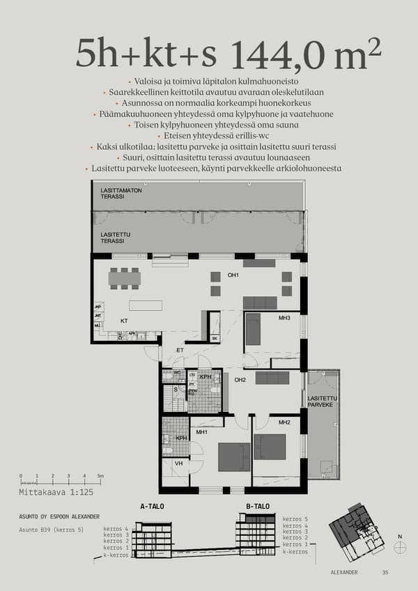 Päämakuuhuoneen yhteydessä on oma kylpyhuone sadesuihkuineen sekä vaatehuone. Toisen kylpyhuoneen yhteydessä on oma sauna, joka lämpenee aina halutessasi. Eteisessä on myös erillis-wc, johon on mahdollista teettää seinä-wc lisähintaisena muutostyönä.