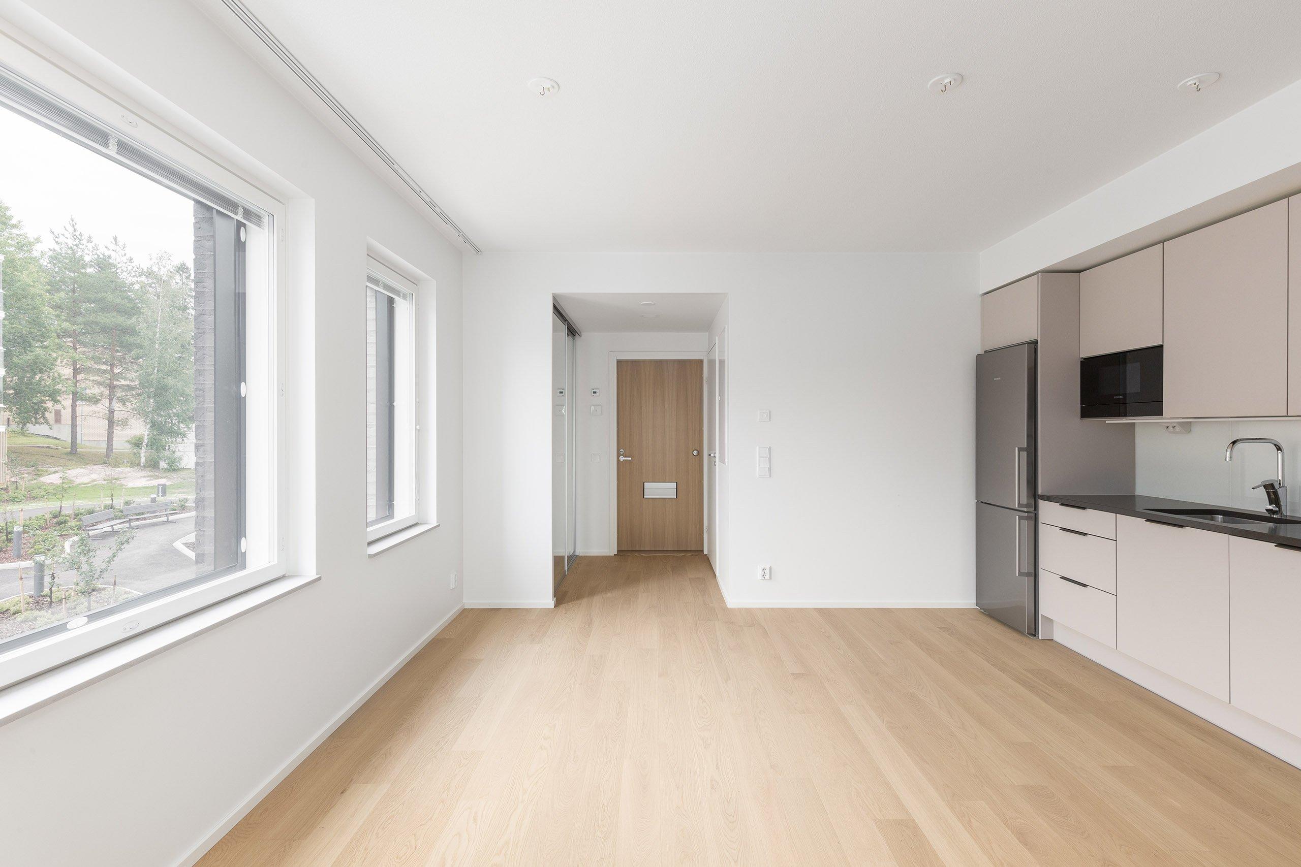 Asunnon keskiössä on moderni keittotila, joka avautuu oleskelutilaan. Matalalämpöisen lattialämmityksen ansiosta seinillä ei ole pattereita, joten asunnon sisustaminen on vaivattomampaa.