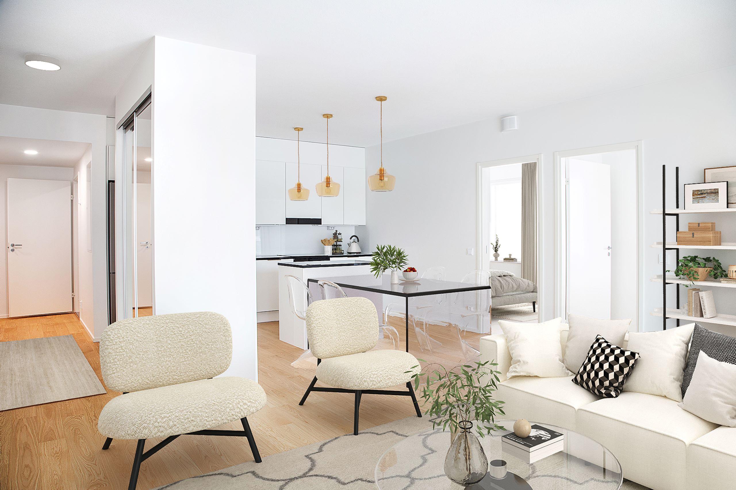 Tässä valoisassa asunnossa on ikkunat kahteen suuntaan, kaakkoon ja lounaaseen. Asunnon keskiössä on saarekkeellinen keittotila, joka avautuu viihtyisään oleskelutilaan. Asunnon makuuhuoneet ovat tilavia ja valoisia. Matalalämpöisen lattialämmityksen ansiosta seinillä ei ole pattereita, joten asunnon sisustaminen on helppoa.