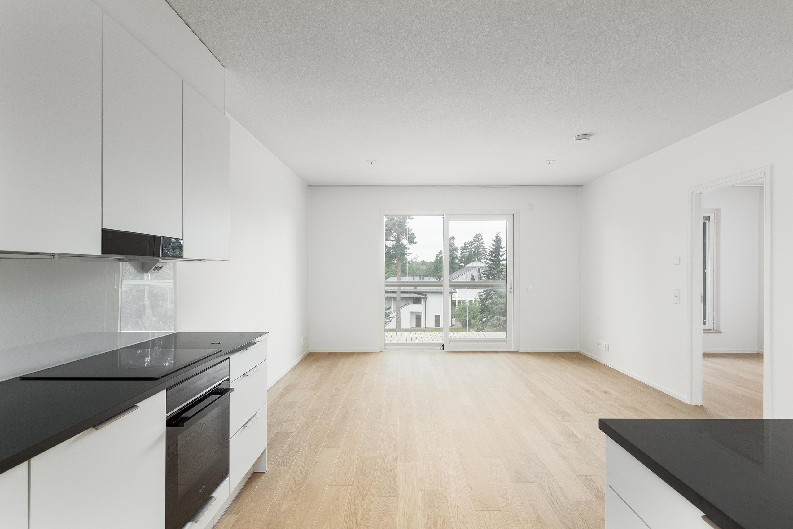 Asunnon lattiamateriaalina on vaalea yksisauvainen tammiparketti. Keittotilassa tyylikkäät hiekansävyiset, satiinipintaiset kalusteovet, alakaapeissa oven sävyiset lippavetimet. Kodinkoneet ovat Siemensin. Välitilassa on puhtaan valkoinen lasi, työtaso vaaleaa kvartsikiveä. Altakiinnitetty allas.