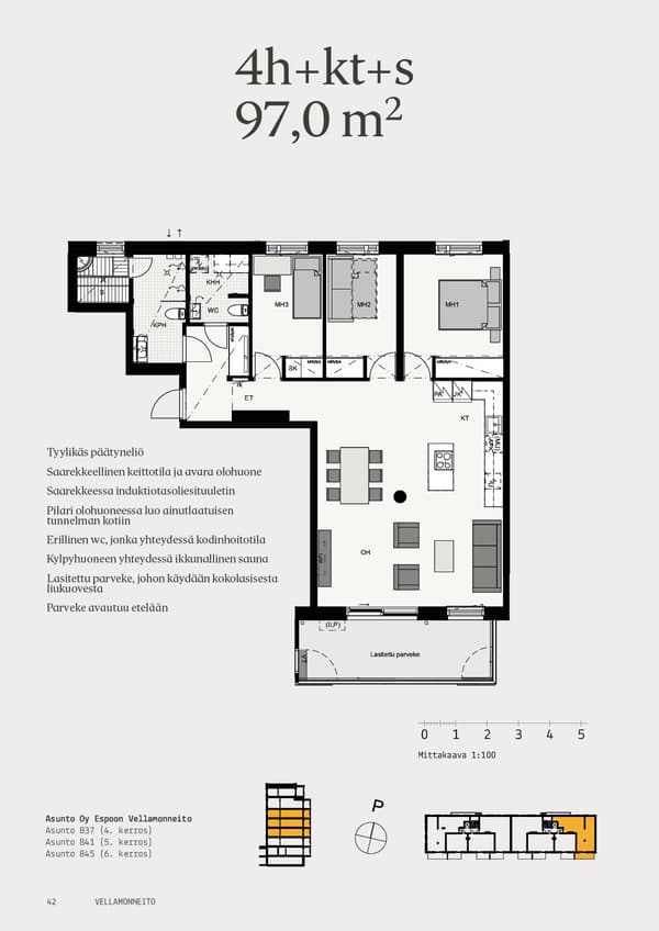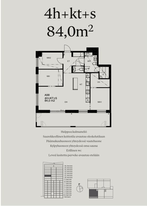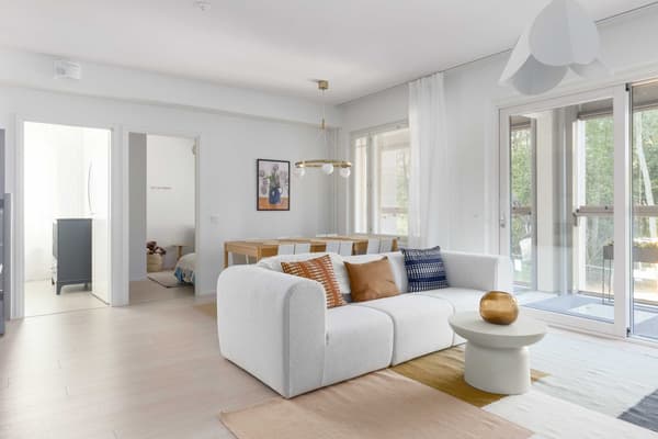 Tässä hulppeassa perheasunnossa on avara oleskelutila, jonka yhteydessä Puustellin saarekkeellinen avokeittiö, kvartsikivitasoineen. Asunnossa on mukavasti säilytystilaa, ja päämakuuhuoneen yhteydessä on oma vaatehuone.