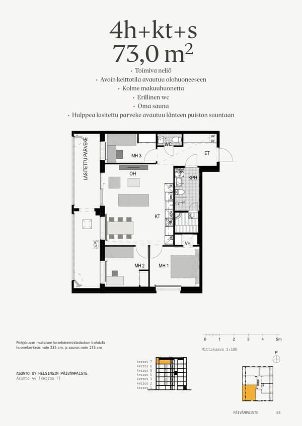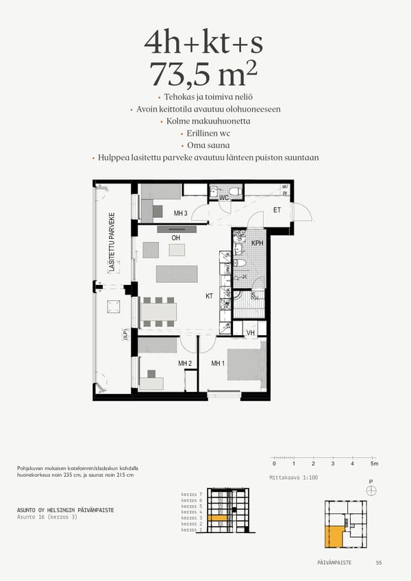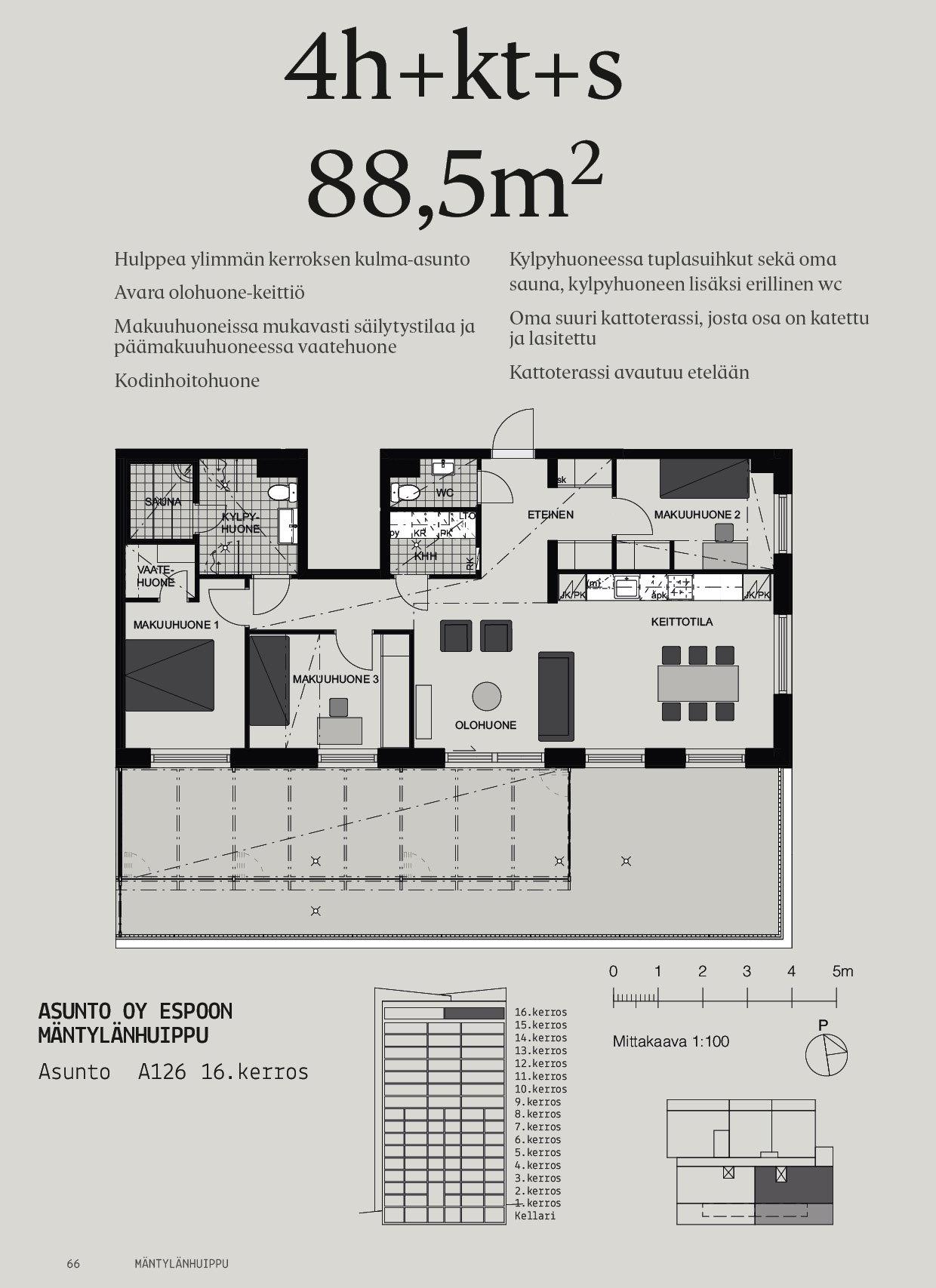 Kolme makuuhuonetta, joissa on mukavasti säilytystilaa ja päämakuuhuoneen yhteydessä oma vaatehuone. Arkea helpottamassa oma kodinhoitohuone. Kaksi wc:tä ja oma sauna, joka lämpenee aina halutessasi. Kylpyhuoneessa on tuplasuihkut. Asunnon ehdoton herkku on oma hulppea kattoterassi, josta osa on katettu ja lasitettu. Kattoterassi avautuu etelään!