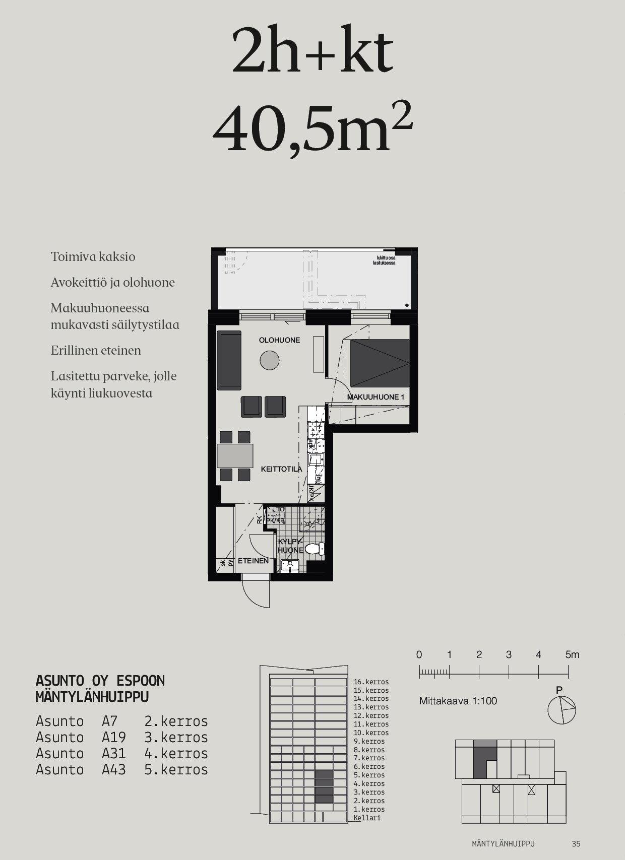 Kodin keskipisteenä on viihtyisä oleskelutila, jonka yhteydessä moderni avokeittiö. Makuuhuoneessa on seinällisen verran säilytystilaa. Erillinen eteinen rauhoittaa kodin tunnelmaa. Olohuoneen yhteydessä on liukuovella varustettu lasitettu parveke, joka on kuin ylimääräinen huone keväästä pitkälle syksyyn.