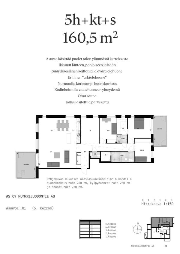 Nämä ylimmän kerroksen näkymät kuuluvat vain harvoille. Asunto aukeaa etelään, länteen ja pohjoiseen. Avara olohuone asunnon kulmassa avautuu luontevasti kohti lasitettua terassiparveketta. Porrasaskelmat luovat tilaan vaikuttavan ja ylellisen arkkitehtonisen efektin. Keittotila isoine kylmälaitteineen ja saarekkeineen rajaa oleskelutilaa pehmeästi mutta pitää kokonaisuuden avoimena ja valoisana.