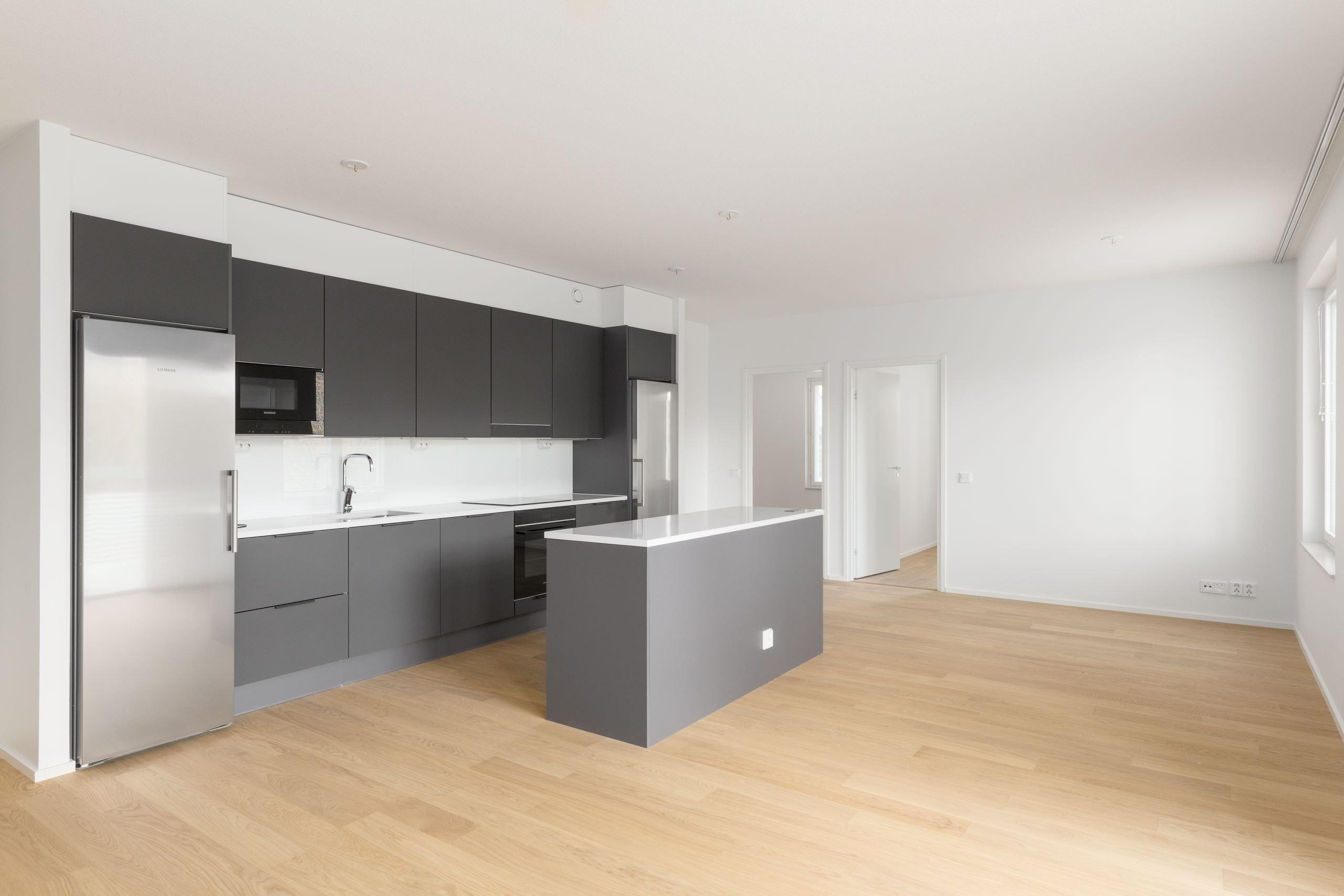 Tämän asunnon keskiössä on ihana saarekkeellinen keittotila, joka yhdistyy olohuoneeseen. Keittotilassa on täyskorkeat kylmälaitteet.