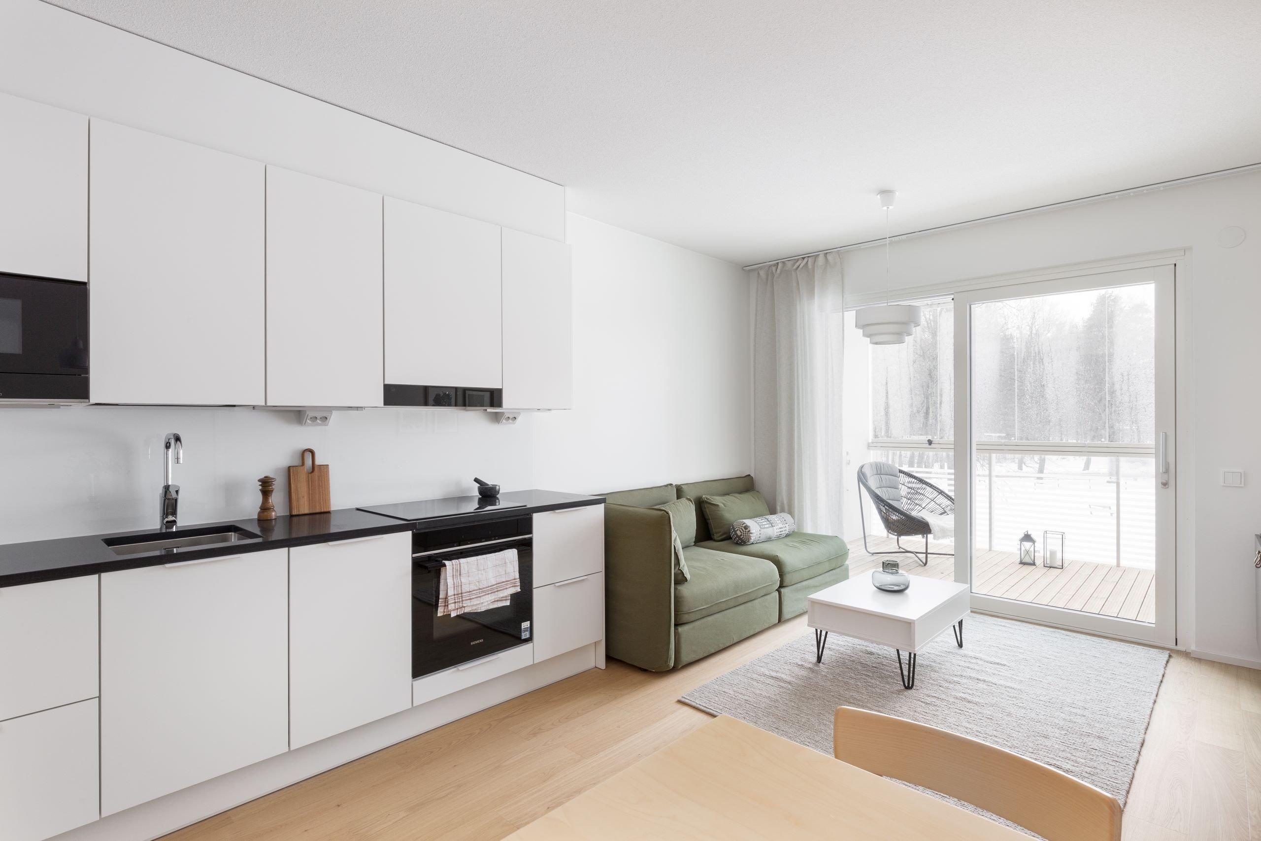 Tässä asunnossa on avoin keittotila, joka yhdistyy olohuoneeseen. Makuuhuoneen yhteydessä on vaatehuone. Kylpyhuoneen yhteydessä on oma sauna, joka lämpenee aina halutessasi. Saunan jälkeen on ihana vilvoitella omalla lasitetulla parvekkeella.