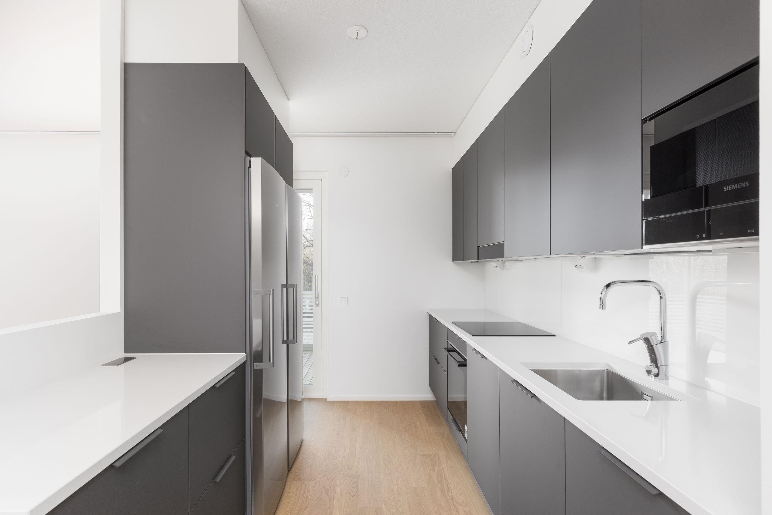 Tässä asunnossa valoa riittää, sillä ikkunat ovat kahteen suuntaan. Tyylikäs saarekkeellinen keittotila yhdistyy avaraan olohuoneeseen. Keittotilassa on täyskorkeat kylmälaitteet.
