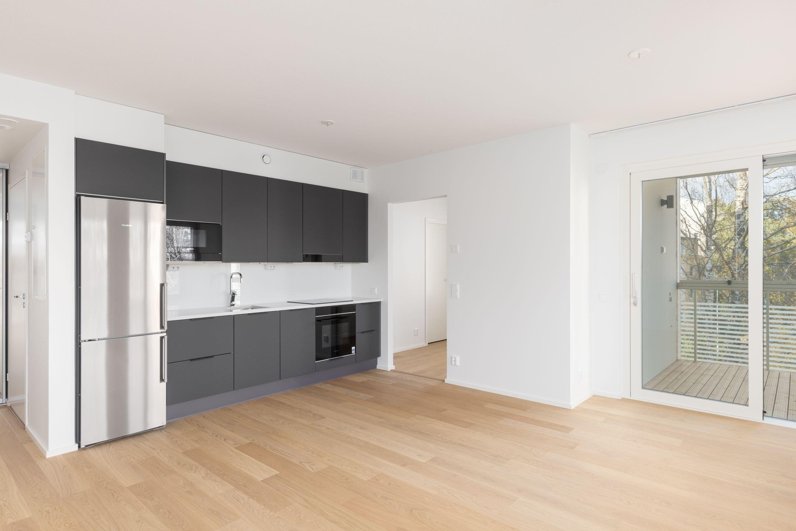 Tässä tehokkaassa kaksiossa avoin keittotila yhdistyy viihtyisään oleskelutilaan. Makuuhuoneen yhteydessä on vaatehuone ja kylpyhuoneen yhteydessä on oma sauna, jonka löylyissä kelpaa rentoutua. Saunan jälkeen on mukava vilvoitella omalla lasitetulla parvekkeella.