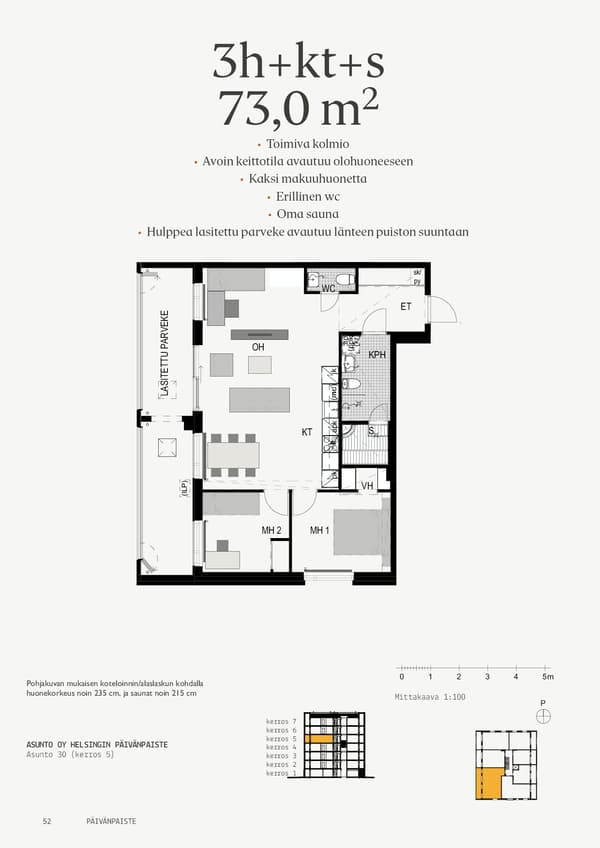Tässä tehokkaassa kolmiossa on avoin keittotila, joka avautuu viihtyisään olohuoneeseen. Keittiön kalusteet ovat Puustellin ja eteisessä sekä molemmissa makuuhuoneissa säilytysratkaisut ovat toimivaa Elfaa. Kylpyhuoneen yhteydessä on oma sauna. Saunan jälkeen on mukava vilvoitella omalla lasitetulla parvekkeella. Parvekkeelle käydään kokolasisesta liukuovesta ja se avautuu kohti länttä, vehreän puiston suuntaan.