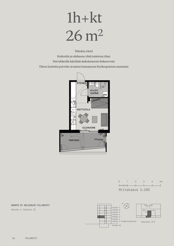 Tässä toimivassa pikkukodissa keittotila ja olohuone ovat näppärästi hiukan erillään toisistaan. Keittotilassa on hyvin tilaa ruokapöydälle. Olohuoneen yhteydessä on mukavasti tilaa myös sängylle, jonka voi sijoittaa erilliseen alkoviin. Alkovissa on tilaa suuremmallekin sängylle. Omalle lasitetulle parvekkeelle käydään kokolasisesta liukuovesta. Parveke avautuu koilliseen ja kaakkoon, Radiokadun suuntaan. Katso kuva/kuvia asunnon parvekkeelta. Kuva on otettu syyskuussa 2025 ja vastaa tilannetta kuvanottohetkellä.