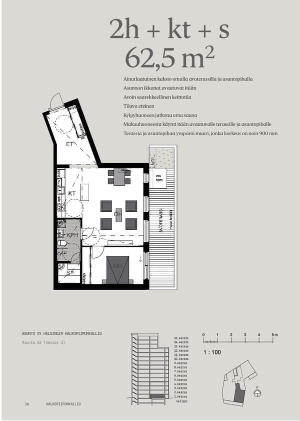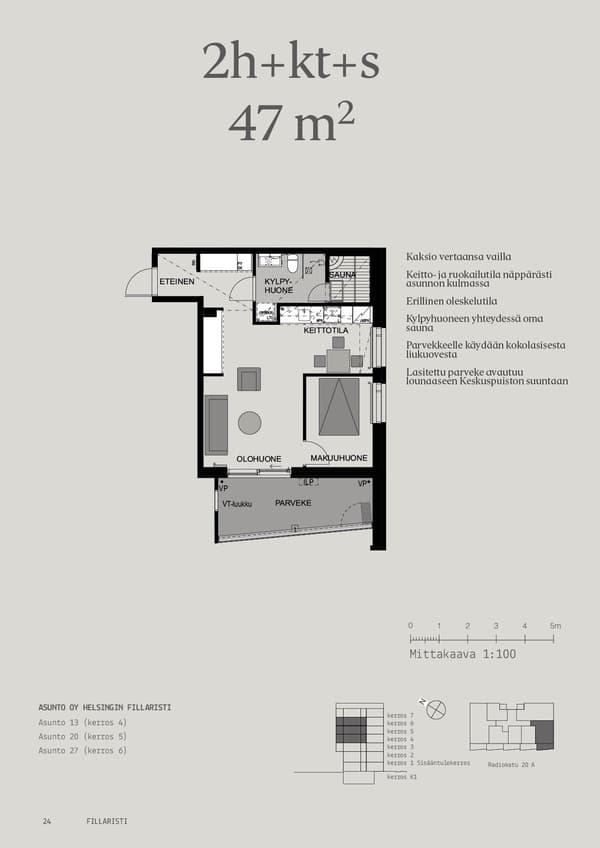 Asunnossa on huipputason sisustusvalinnat, kuten Puustellin keittiökalusteet, kvartsikiviset työtasot sekä mattalakattu yksisauvainen tammiparketti.