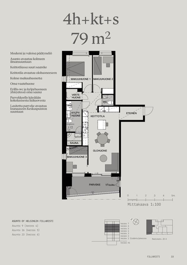 Koko asunnossa on huipputason sisustusvalinnat, kuten Puustellin keittiökalusteet, kvartsikiviset työtasot sekä mattalakatut yksisauvaiset tammiparketit.