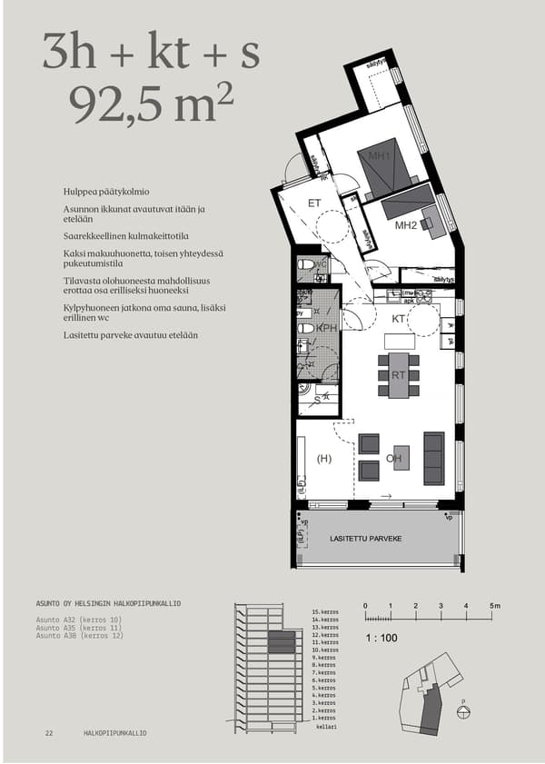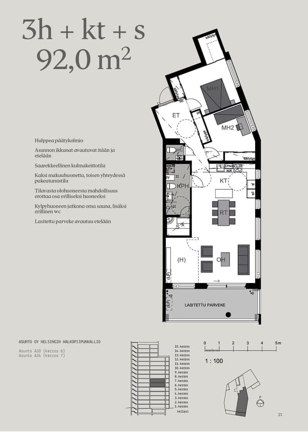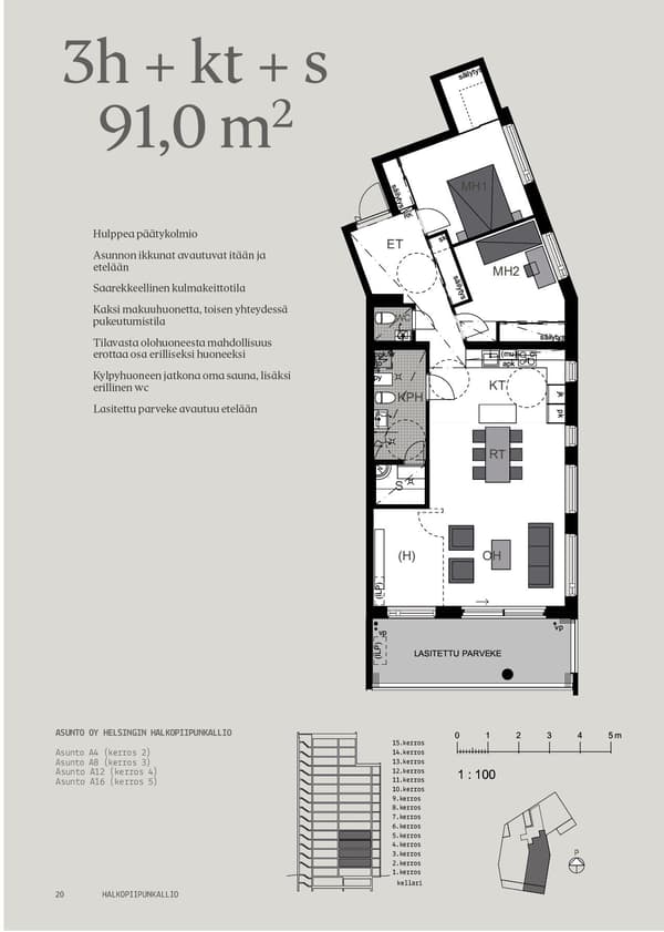 Tässä avarassa asunnossa on ikkunat kahteen suuntaan, joten valoa riittää. Tyylikäs saarekkeellinen kulmakeittotila avautuu tilavaan olohuoneeseen. Lisäksi olohuoneesta on mahdollisuus erottaa osa erilliseksi huoneeksi. Asunnossa on kaksi makuuhuonetta, joista toisen yhteydessä on erillinen pukeutumistila.