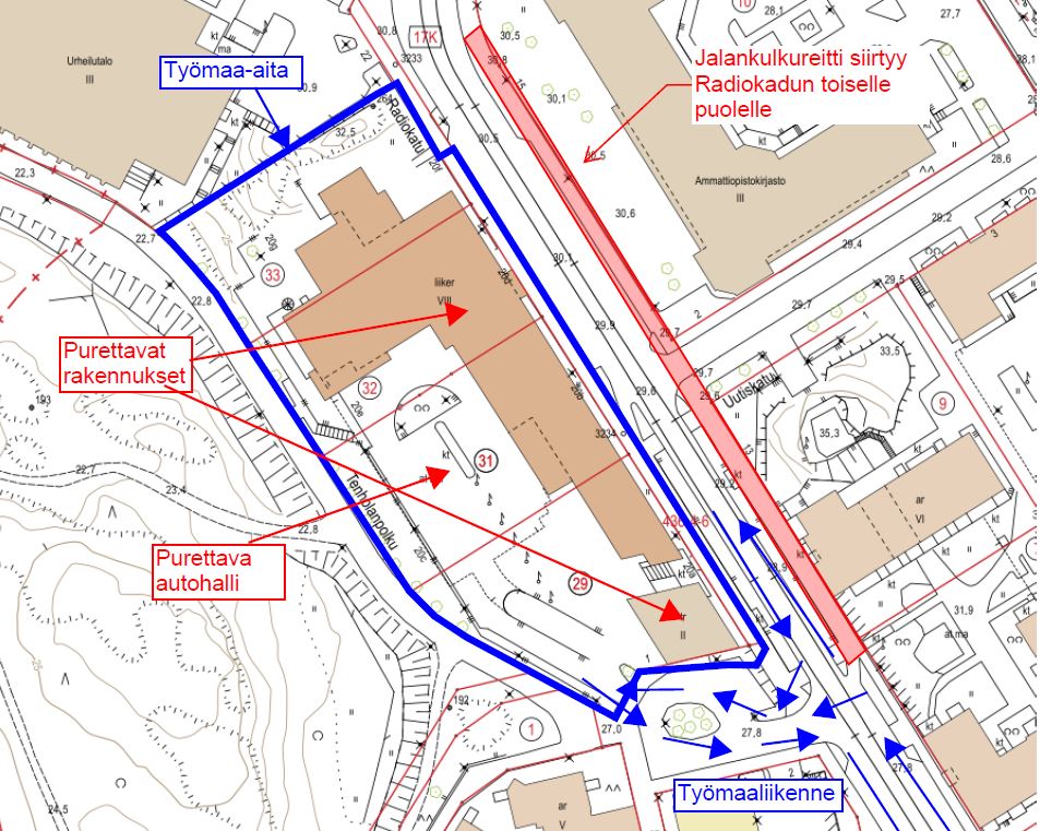 Radiokatu 20:n tontilla purkutyöt ovat edenneet suunnitellusti. 29.7. alkavalla viikolla aloitetaan tulevan uudisrakentamisen ennakkovalmisteluita, ja ensimmäisten maanrakennustöiden takia Tenholanpolun kevyt liikenne joudutaan siirtämään poikkeusreitille noin kolmen kuukauden ajaksi.