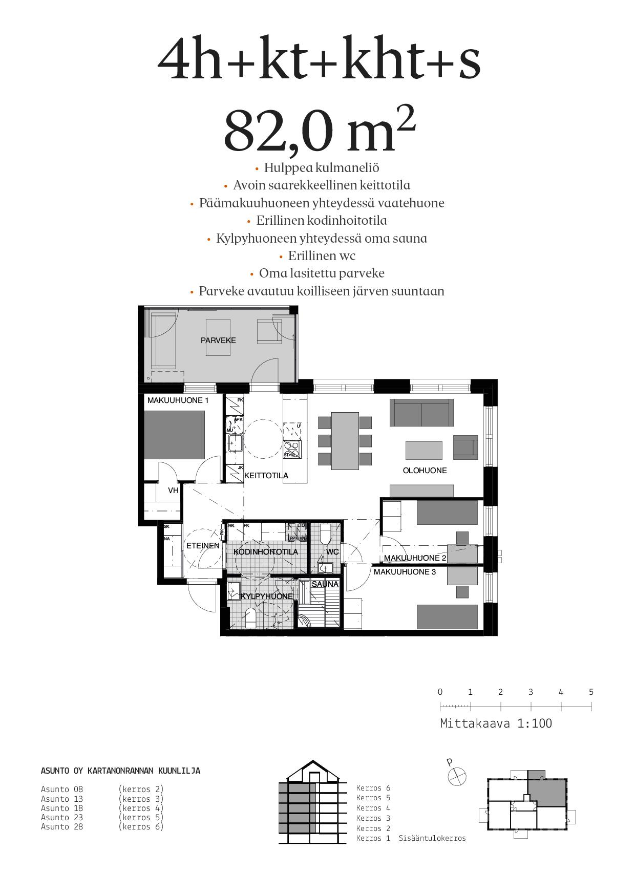 Hulppea kulmaneliö veden äärellä, uudella Kartanonrannan asuinalueella! Tässä valoisassa neliössä on avoin keittotila ja olohuone. Keittotilassa on saareke ja tilaa suuremmallekin ruokapöydälle. Koko asunnossa on laadukkaat sisustusmateriaalit, kuten Puustellin keittiöt ja säilytysratkaisut. Päämakuuhuoneen yhteydessä on oma vaatehuone ja asukkaiden arkea helpottamassa on erillinen kodinhoitotila sekä wc. Asunnon tunnelman kruunaa oma lasitettu parveke. Parveke avautuu koilliseen, järven suuntaan - katso upeat järvimaisemat asunnosta!