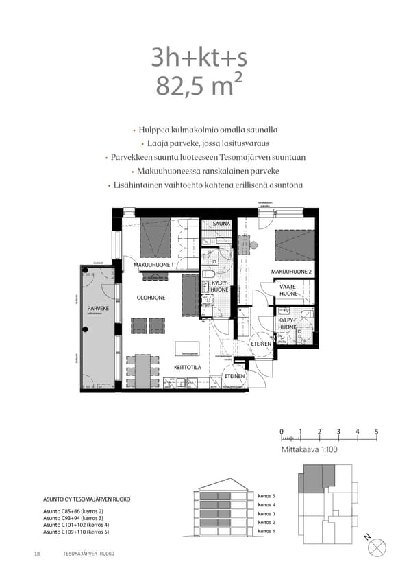 Valoisa päätyasunto, suuret ikkunat ja oma asuntopiha. Avoin keittotila Puustellin kalustein. Makuuhuoneissa mukavasti säilytystilaa. Kylpyhuoneen yhteydessä on oma sauna. Koko asunnon levyinen terassi ja asuntopiha, jotka avautuvat luoteeseen.