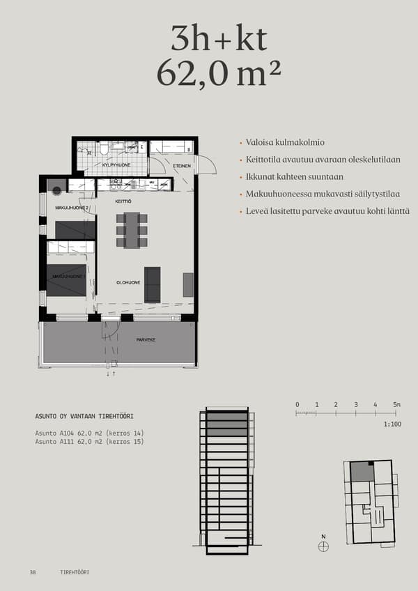 Asunnon ikkunat avautuvat itään ja osin pohjoiseen, joten täällä saa herätä aamuauringon paisteeseen. Lasitettu parveke on pohjoisen puolella, joten siellä voi oleskella koko päivän! Myös parvekkeen sivut ovat lasitetut, joten näkymät avautuvat itään, länteen ja pohjoiseen.