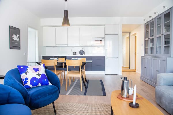 Tämä kulmakolmio todella on neliöitään suurempi. Asunnon keskiössä keittotila-olohuone, makuuhuoneet on rauhoitettu asunnon reunoille. Keittiössä on tyylikkäät Puustellin kalusteet ja kodinkoneet Siemensiltä – esimerkkinä täyskorkeat kylmälaitteet, jotka ovat harvinaista herkkua tämän kokoluokan asunnoissa!