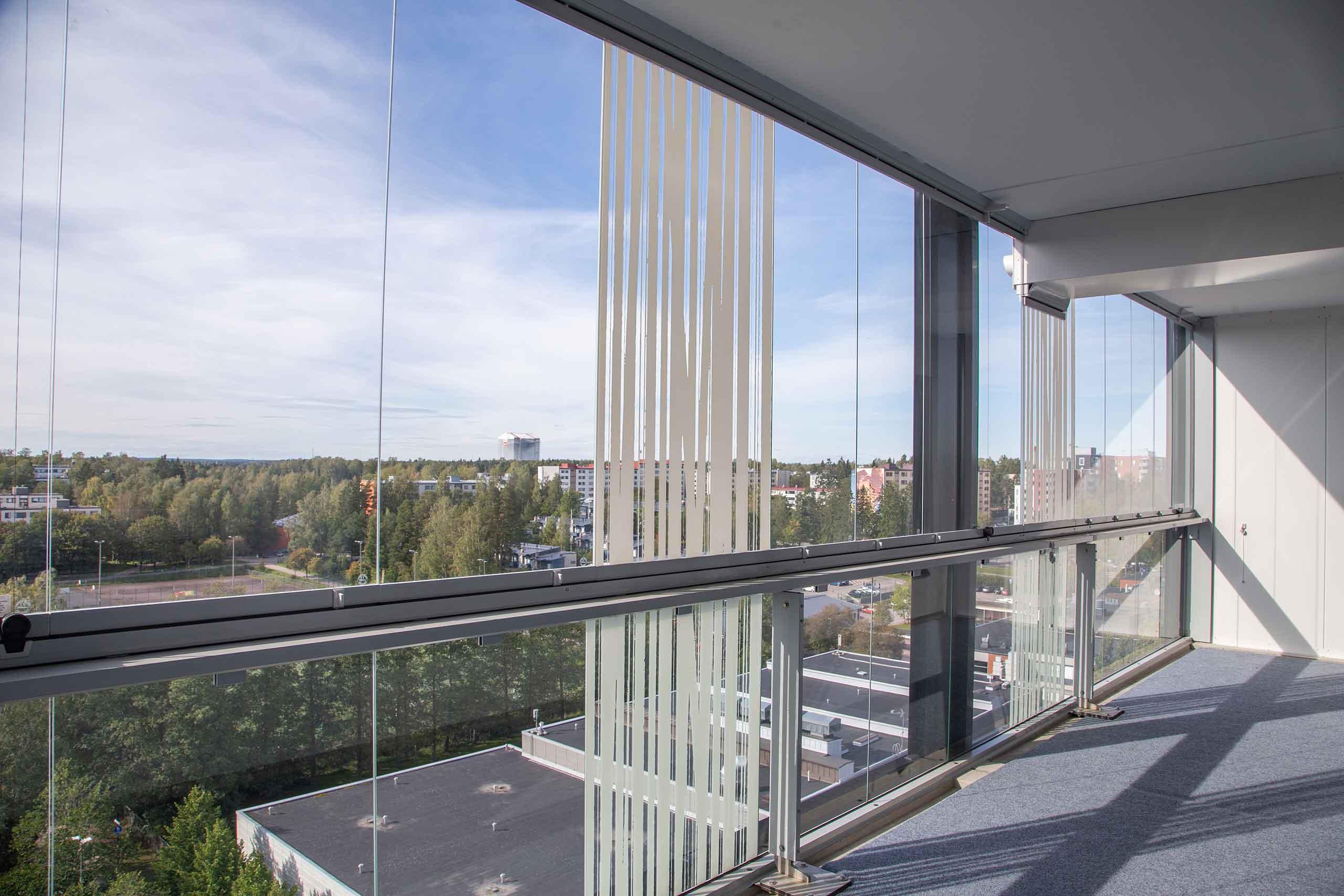 Olohuoneesta käydään koko asunnon levyiselle lasitetulle länsiparvekkeelle. Asunto sijaitsee talon 11. kerroksessa.