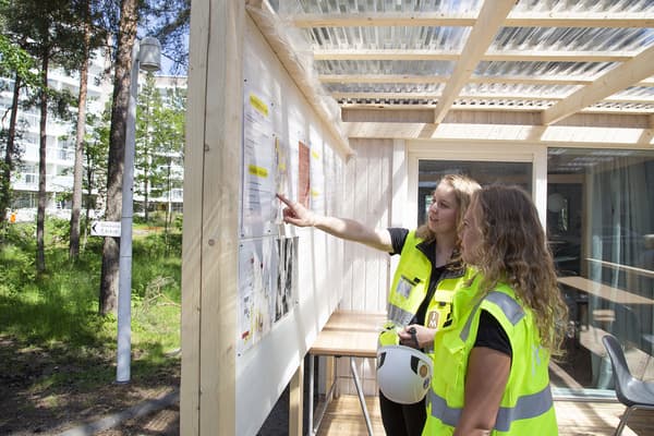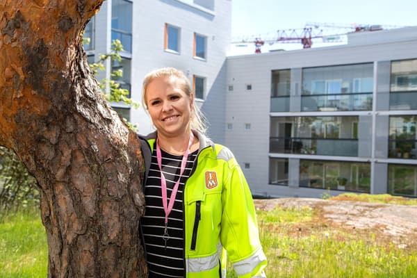 Työmaainsinööri Heli Lehto on työskennellyt JM:llä neljä vuotta. Tällä hetkellä hän toimii Finnoon työmaalla vastaavan mestarin aisaparina uuden korttelin rakentamista koordinoiden.