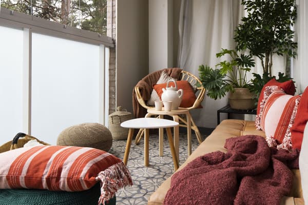 Luo kodikkuutta tekstiileillä, kuten matoilla, pehmusteilla ja tyynyillä. Suosi ulkokäyttöön soveltuvia ja helposti puhdistettavia tekstiileitä. Ulkokäyttöön suunnitellut vedenkestävät ja UV-suojatut kankaat kestävät paremmin auringonvaloa ja kosteutta.