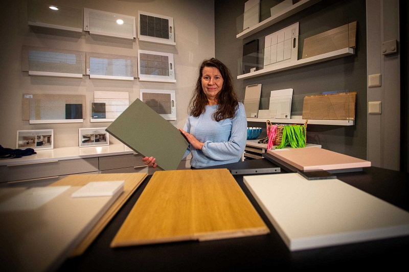 Tuotepäällikkö Tuula Pappi vastaa sisustustiiminsä kanssa JM-kotien laadukkaasta pintamateriaalien valikoimasta eli kaikista kodin sisäpuolisista materiaaleista, kuten maaleista, parketeista ja laatoista.