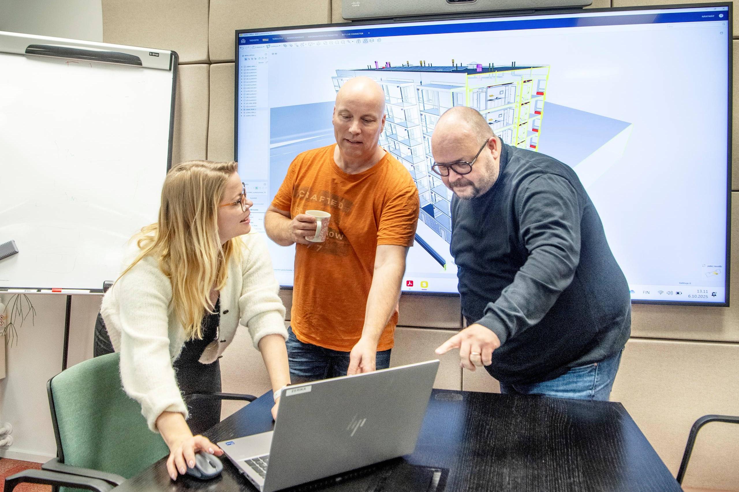 Kuultopaperit ja 2D-piirustukset ovat mennyttä aikaa rakennusten suunnittelussa. Esimerkiksi JM Suomessa on kaikki rakennukset tehty tietomallilla vuodesta 2021 lähtien. Tietomallinnuksella (BIM, Building Information Modeling) tarkoitetaan työskentelyprosessia, jossa rakennuksen geometriset ja toiminnalliset ominaisuudet kootaan digitaaliseen muotoon ja kolmiulotteiseen visuaaliseen näkymään. JM Suomen suunnittelupäällikkö Markus Peiponen kertoo, että mallista näkee esimerkiksi rungon rakenteen, LVI-tekniikan sijoittumisen ja voi hahmottaa, miltä rakennus näyttää valmiina.