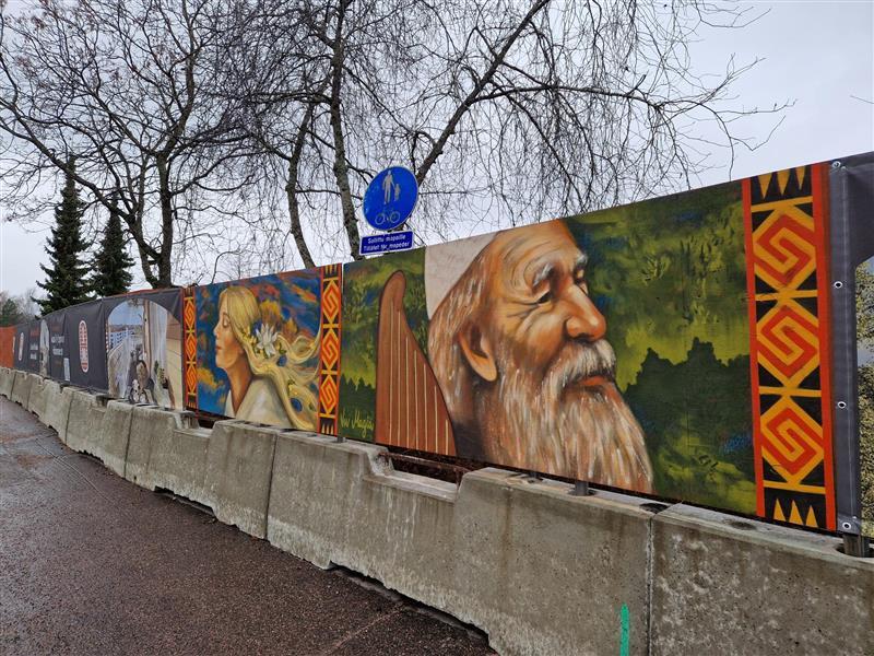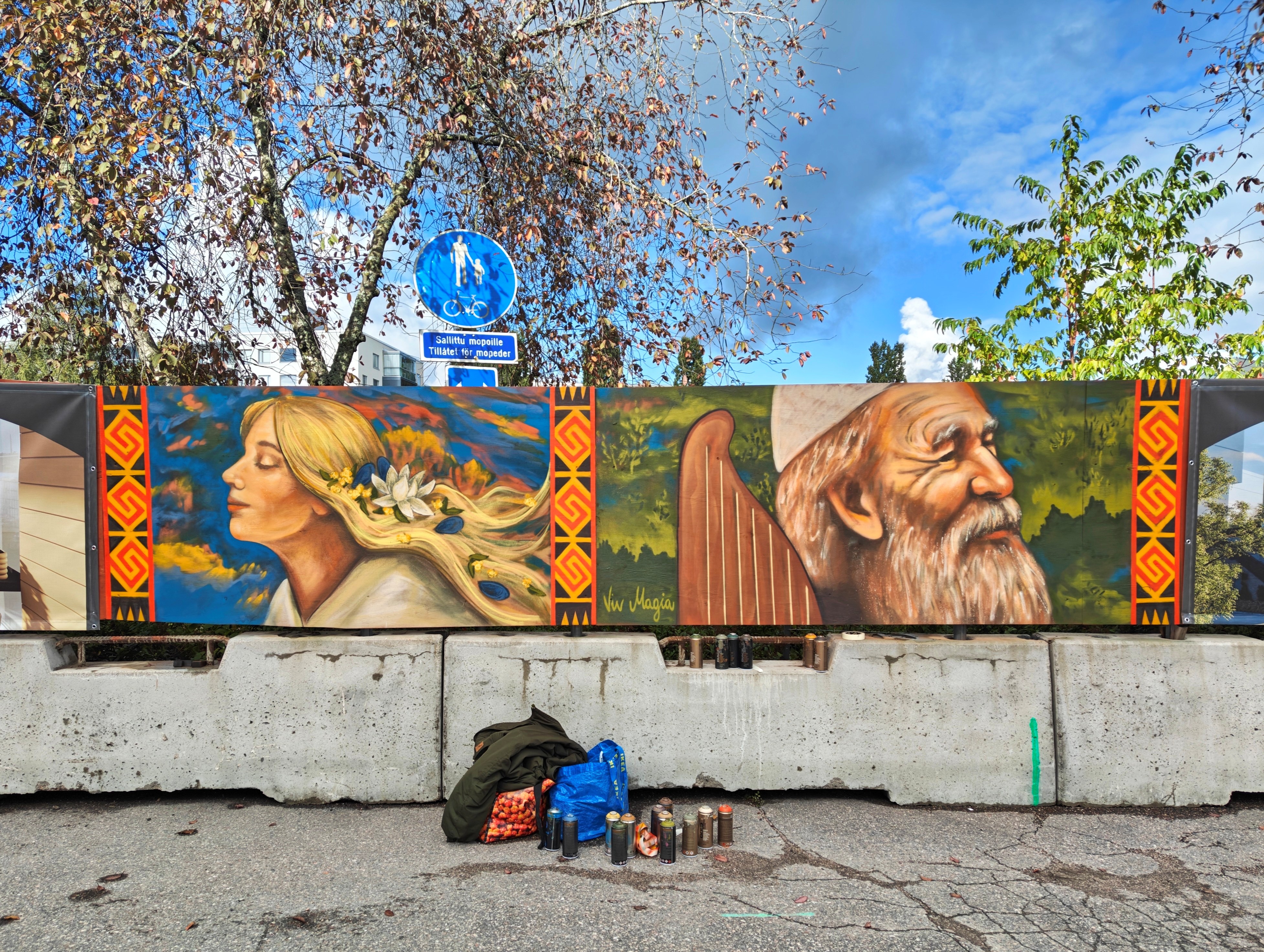 Mimmien Viv Magia eli Viivi Vierinen tarttui haasteeseen ja toteutti spraymaaleilla värikkäät ja kauniit Vellamo- ja Väinämöinen-teokset vaneriseen työmaa-aitaan. Vierinen on kansainvälisesti tunnettu katu- ja kuvataiteilija sekä performanssitaiteilija. Hän ollut mukana tekemässä esimerkiksi Käärijä-muraalia Vantaalla.